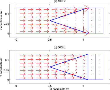 The triangular shape of the foam wedges helps in dissipating sound. Sound waves interacting with the wedges at 100Hz and 300Hz.